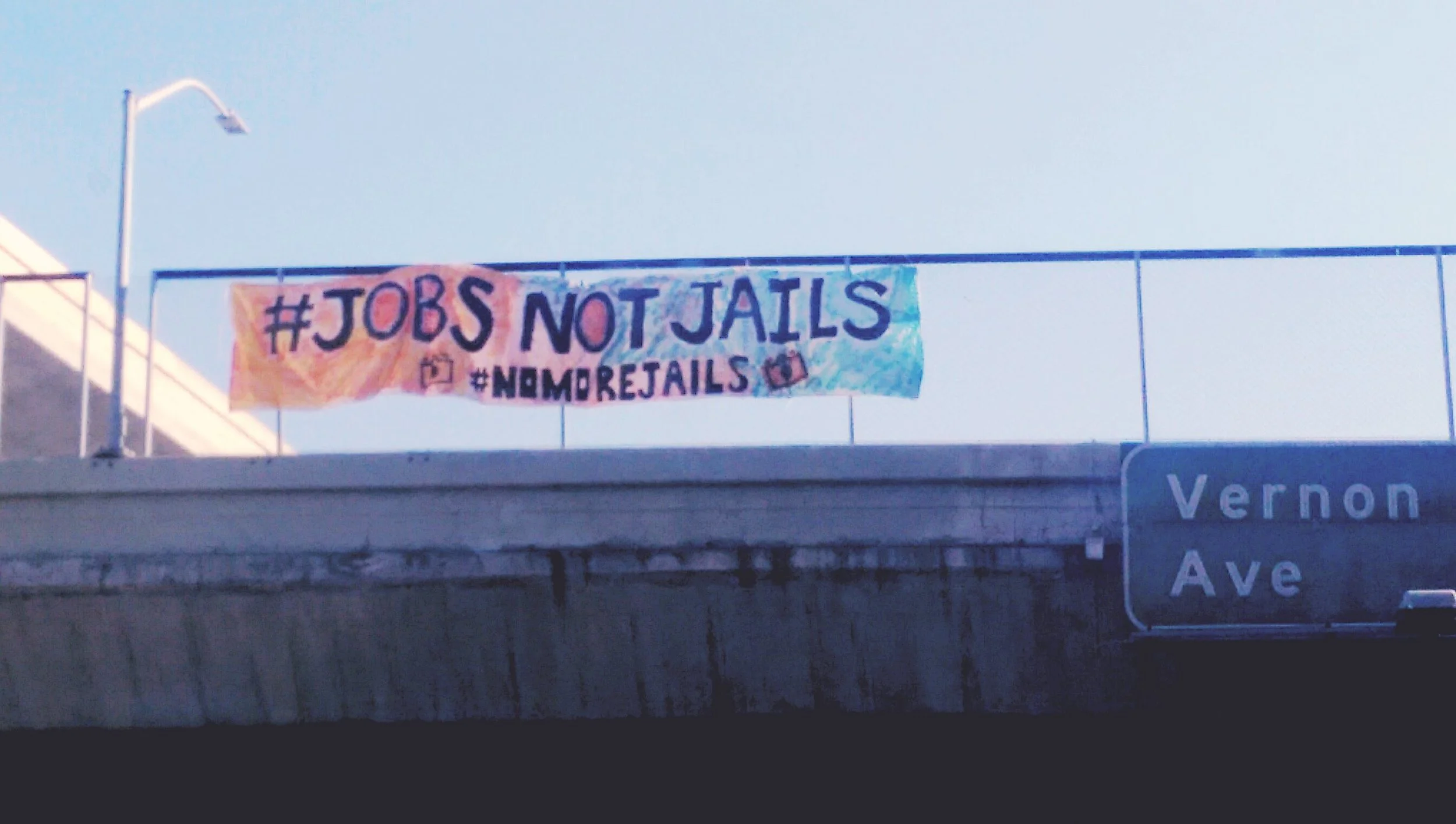 Protest Against For-Profit Prison System in South Central April 01, 2016 by Mucho Arigato jobsnotjail banner in South Central Los Angeles.
